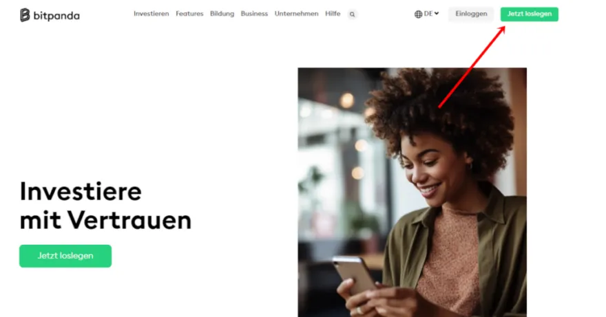 - Auf der Bitpanda-Webseite im oberen rechten Eck den „Jetzt loslegen“-Button anklicken.