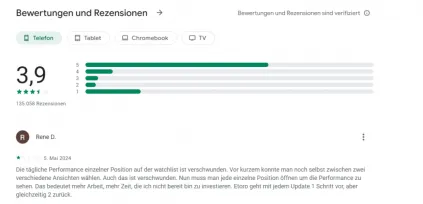 Als einer der weltweit führenden Anbieter im Brokerage-Bereich sind die Bewertungen, die sich online über eToro finden lassen, nicht zu dünn gesiedelt. Alleine aus dem deutschsprachigen Raum gibt es bei Trustpilot über 25.000 sowie mehr als 150.000 Erfahrungsberichte bei Google Play (Stand 2025).