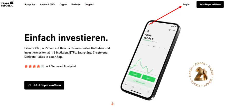 Das Login bei TradeRepublic funktioniert recht simpel. Für das Login über die Webversion von TradeRepublic klickt man auf den Login-Button.