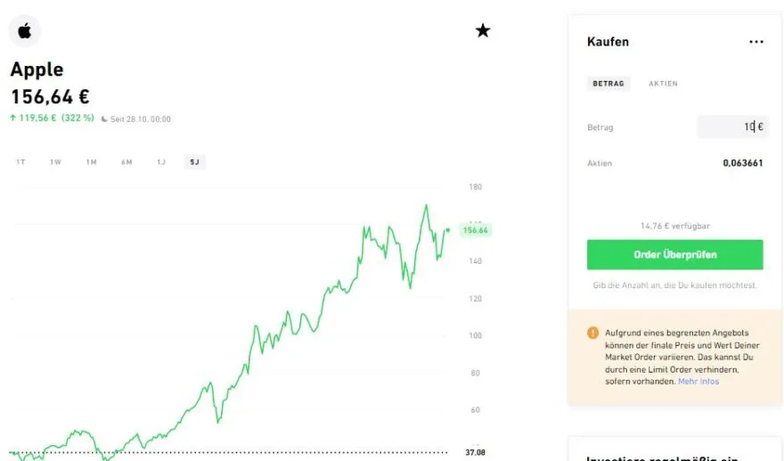 Man kann nur ganze Aktien kaufen, über einen Sparplan ist es aber auch möglich, Teilaktien zu erwerben, falls eine ganze Aktie zu teuer ist. Hier kann man den Marktpreis festlegen und angeben, ob man einen Limit- oder Stoppreis einstellen möchte. Daraufhin kann man den Kauf durchführen, indem man den Kaufen-Button am unteren Ende der Seite klickt.
