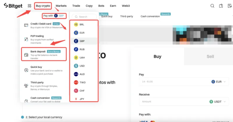 Bevor Sie mit dem Handel mit Kryptowährungen beginnen können, müssen Sie selbstverständlich eine Einzahlung auf Ihr Bitget Konto tätigen. Klicken Sie dazu auf die Schaltfläche „Geld einzahlen“ und wählen Sie Ihre bevorzugte Zahlungsmethode aus. Die Mindesteinzahlung beträgt bei Bitget unabhängig von der Einzahlungsmethode 100 Euro.